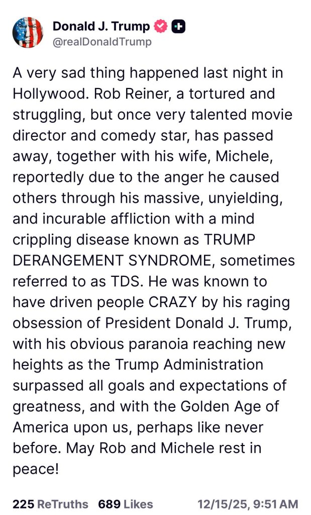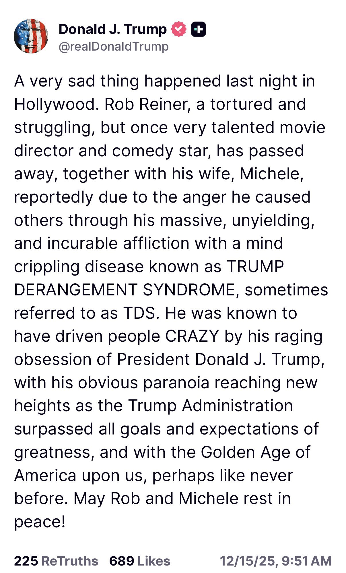 So this is what I have so far and I have had the tweet for less then 4 hours. So in view of the loss of Rob Reiner, who gave us  All in the Family (My introduction to Rob Reiner), the Princess bride, When Harry met Sally, Misery and a Few good men and several others. I think I countered the tweet by @realDonaldTrump, I think I got my creative revenge. I didn’t get to introduce on how Ivanka and Barron Trump had to flee to Russia as most Americans had their fill of the Trumps where they get to be toys of the Russian Mafia. Well the world turns in many unexpected ways.