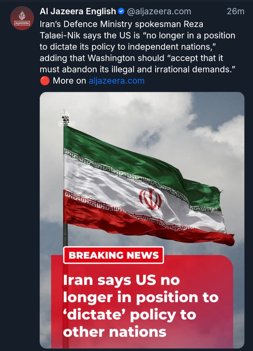 That is what was going through my mind the day before yesterday and yesterday I saw something by Al Jazeera who illustrates it to you in a more profound way. They ‘quoted’ “Iran says US no longer in position to ’dictate’ policy to other nations”