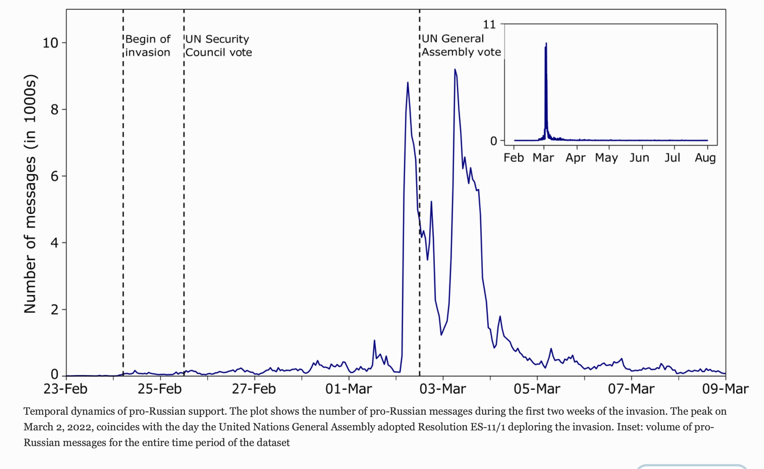 That is something we often hear, yet I haven’t said these words for almost ever. You see, news media is now realising that the Russians are closer to losing the war that ever. For this I think it is time that we go back to (the beginning) February 24th 2022. This set it all in motion and we were given “The Russian invasion of Ukraine in February 2022 was accompanied by practices of information warfare, yet existing evidence is largely anecdotal while large-scale empirical evidence is lacking. Here, we analyze the spread of pro-Russian support on social media. For this, we collected messages from Twitter with pro-Russian support. Our findings suggest that pro-Russian messages received ∼251,000 retweets and thereby reached around 14.4 million users” these are the opening words of Dominique Geissler, Dominik Bär, Nicolas Pröllochs & Stefan Feuerriegel. We are then given “A widespread concern is that practices of modern warfare in form of large-scale Russian propaganda campaigns are used to shape the narrative around the war, yet corresponding research is still nascent. On the one hand, the Russian government enforced new legislation exerting power over traditional media outlets to persuade citizens to support the war. As a result, domestic media outlets are forced to adopt the official narrative. On the other hand, Russian propaganda has been suspected to influence other countries outside Russia, in particular, by using social media to promote hostility against the West”