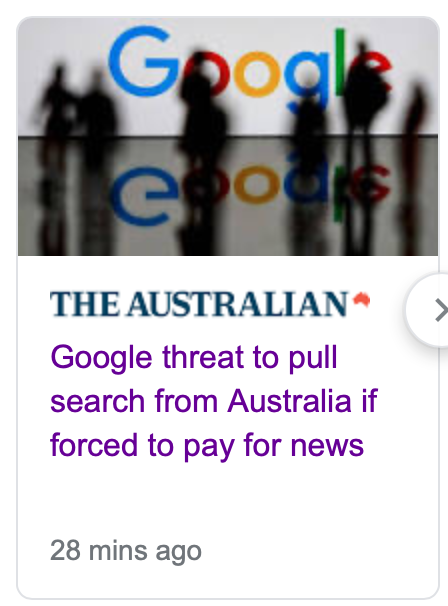So when we consider “forced to pay news outlets for showing links to their websites and stories under a new media code”, Google can just block all the Australian news sources and offer BBC, Al Jazeera, Fox News, Guardian UK and CNN links. Let not forget that the bulk of Australian news is shoddy at best and most of them all copy and paste from an American source (Reuters), when you make a tally, we see a setting (as I personally see it) where the news in Australia is not news, it is filtered content to appease shareholders, stake holders and advertisers in Australia, as such, when they lose their Google links the game will get rather interesting soon enough, but that is merely my $0.02 on the matter.