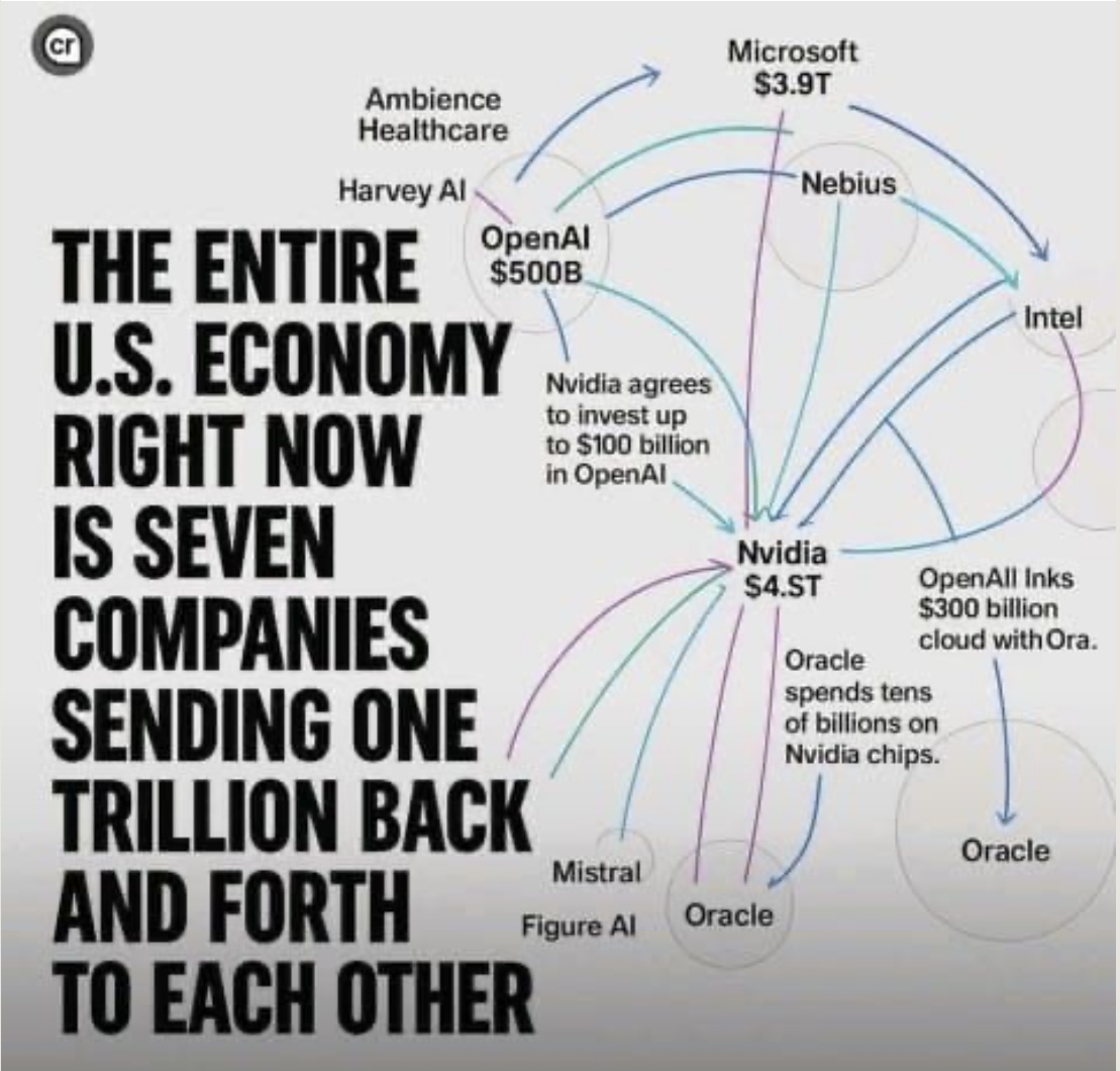 The image above was shown in LinkedIn, I never thought of it this way, where we see “The entire U.S. economy right now is seven companies sending one trillion back and forth to each other” that is how it could be seen (credit of image unknown) but is that GDP revenue? I reckon that some might validly disagree and that is before you consider what OpenAI is costing America and Microsoft (at 3% revenue it isn’t really an asset is it?)