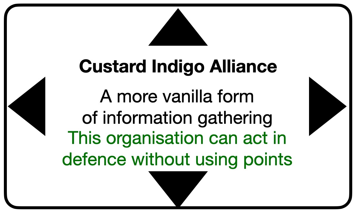 I decided on making fun of the current alphabet groups. In the example I created a ‘CIA’ card, but it could have been MI-6, DGSE or another team, all with a ‘new’ designation. So in this case the CIA header card will have the ability to defend an attack without using defense points. But there are other abilities. It connects on all 4 sides, all header cards do that. It is the combination that makes for a structure.