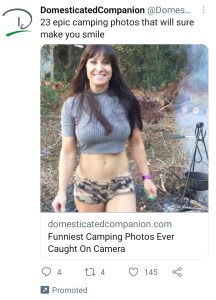 And now we get to the first part, when is perception the brand. What is the perception? Are the tweets safe? Is the word ‘promoted’ enough? When we look at “Promoted Tweets are ideal when you want to increase your Twitter audience reach and engagement. When you have a big announcement, a new blog post, a marketing campaign, or an upcoming event you’d like to reach more people than you would organically, Promoted Tweets is the better strategy. This is because your Promoted Tweets will appear in users’ live feeds and search results” we see and accept that, yet when we see promotion emphasised by large breasts, is it advertisement, or deceptive conduct? Some people might not be able to tell the difference, and I believe that it becomes more and more about the ambiguity of perception. So, as such is the ‘shaming of people like Chloe Khan and Jodie Marsh warranted? As the Advertising Standards Authority is failing people, millions of people on Twitter, on iOS and Android games, is going after smaller players not merely hypocritical? As such, is the advertisement of 23 camping pictures deceptive? Perhaps the overload of advertisements is merely a side effect? As such, does the inability to act against Twitter, Facebook and Mobiles games not merely make the act against the influencers slightly overkill? And all this is before we take notice of “The ASA was responding to the #filterdrop campaign that called for it to be compulsory for influencers to state when they use a beauty filter to promote skincare or cosmetics”, this is what magazines have been doing for years, where was the Advertising Standards Authority then?