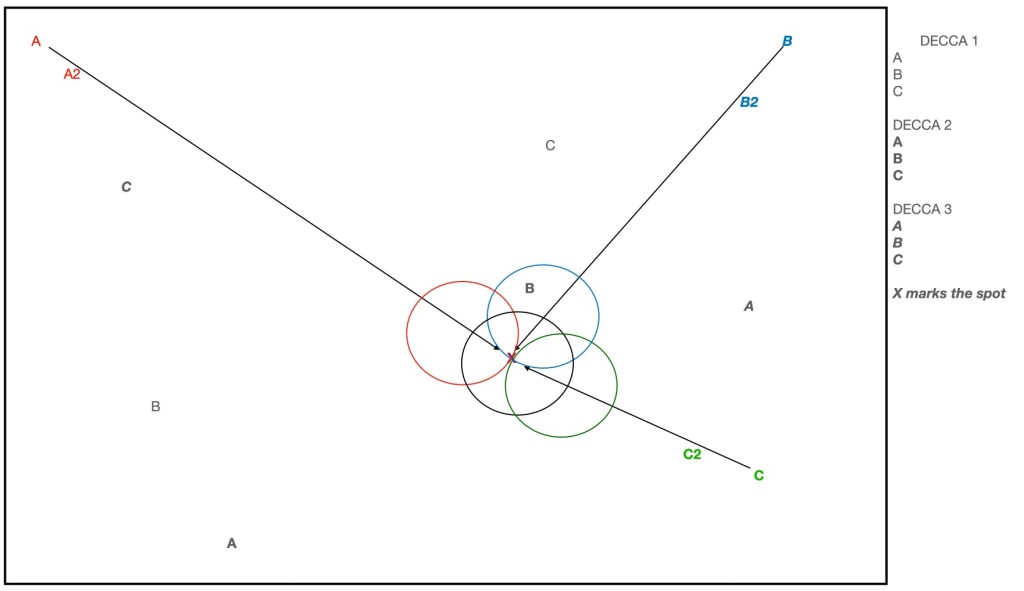 Within the mind there is a setting we forget, it is pondering, we ponder thins, we always do, at times not ever conscious or frontally aware, but we do. It is a part of us and my part would not let the previous story ‘Intent or Not?’ started something that would not let go, most likely to the stage of my youth, in this, my idea of DECCA gave me another optional idea. Consider any map, as such the map I drew has no features, it has however has three DECCA options and the clever station uses one signal of each to create a 4th option. So the three stations 1, 2, 3 create a new option, there would be the optional advantage of internal checks, as such it is harder to decipher how the data is concluded, there is also the need to find a larger amount of numbers to optionally hack, but how?