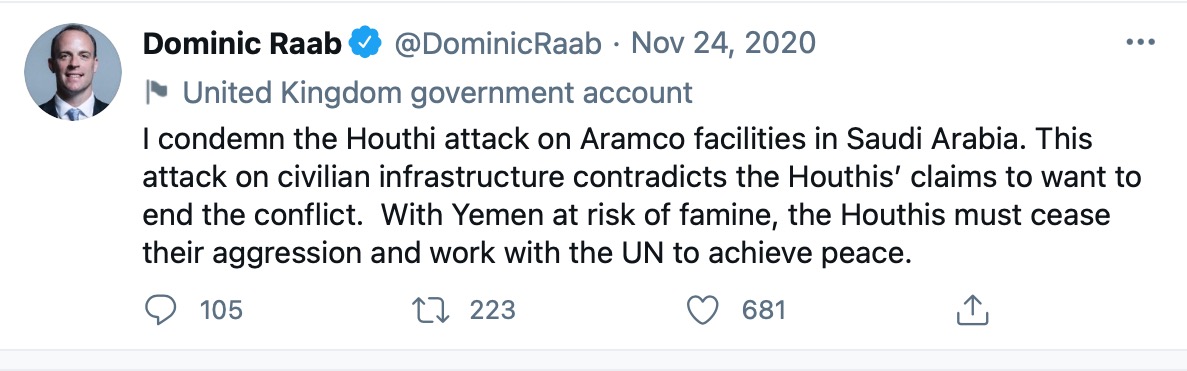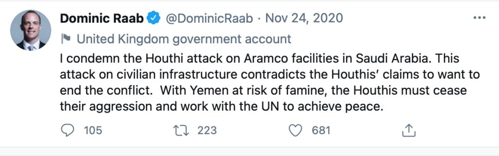 And in this we get back to the Princess Latifa story, it is not about her, but about one part that was in the article. ““I’ve seen some of the footage and it’s deeply troubling”- Dominic Raab”, I will agree that a cushy life in the UK is optionally all that UK Foreign Secretary Dominic Raab knows, or so we can presume. So what does that have to do with the other parts? Yes that is a good question, you see last November Dominic Raab Tweeted (see image), and he was eager to condemn the Houthi people, yet in this he seems to forget that the Houthi forces could not have done it. The distance, the precision and a few other facts make the setting that Iran was the only perpetrator. The hardware could not be made in Yemen, the hardware could not be operated by Houthi forces and there is no way that Houthi forces got over half a dozen targets with almost 100% precision when an inverted setting (one in six) is all they could have hoped for (at best). So how come Dominic Raab was that badly informed? As I see it this is a political sleight of hand and the USA whilst showing a short-minded slight of brain (aka delusional setting) is adding to the Fues of chaos and confusion. So how come that the BBC will do whatever it can to avoid settings? I am not ignoring ‘Yemen: The boy who saved his sister from a sniper’ (source: BBC), but when you see the amount of visibility a princess gets (with Dominic Raab rhetoric) whilst the actions of Iran are ignored again and again is a massive issue. When I look at the top 50 articles on “Houthi” and “Iran” the BBC does not show up once, yet Fox News (you know the channel that is criticised by all others) gives us ‘UN experts find ‘growing’ evidence Iran sending weapons to Houthi rebels in war-torn Yemen’, personally I believe that they are a bit late to the party and we should accept that they showed up at all, so how much evidence on Iranian involvement in Yemen did the BBC (and a few others) give us? So when one MP gives the other MP (Dominic Raab) ‘Classifying Houthis as Terrorists will Worsen Famine in Yemen’ we need to consider that NOT designating them terrorists does not help matters. The Houthi transgressions have been going on month after month. I gave voice to that in ‘Be the bitch’ (at https://lawlordtobe.com/2019/07/07/be-the-bitch/) well over 198 months ago. As such they are to be seen as terrorists, a stage where Iran is equally guilty, so after a years, it is time for these so called ‘distinguished’ journalists to come to the party and properly identify the players as well as their acts.