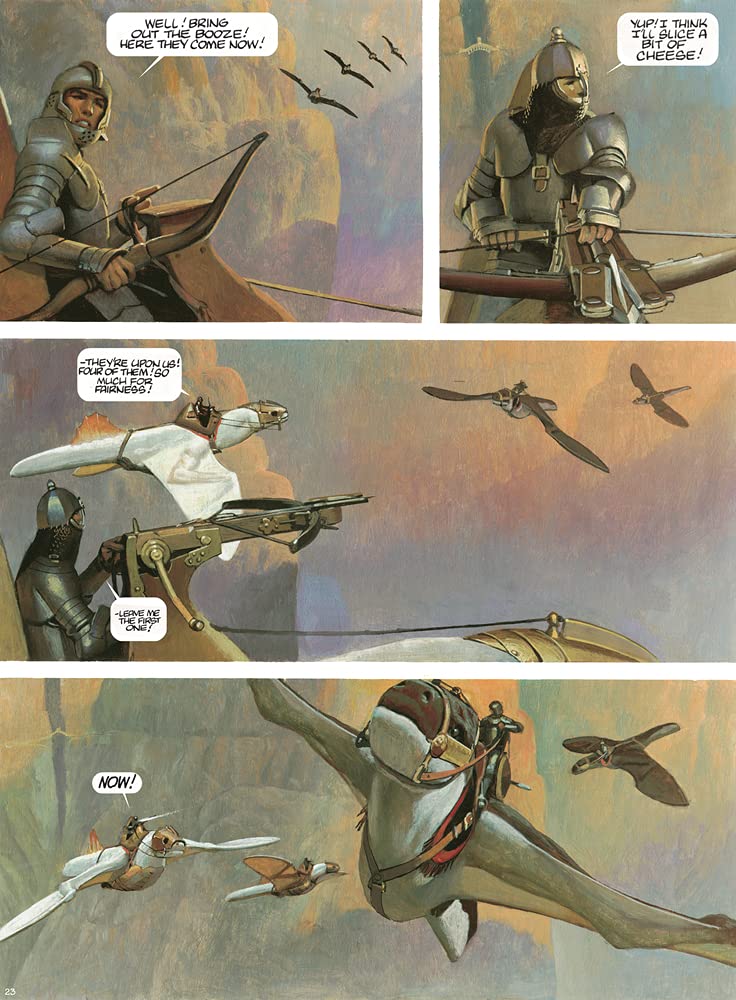 The fact that a comic (1965-1982) with artists like Don Lawrence; Oliver Frey; Gerry Wood; Philip Corke; Ramon Sola; Ron Embleton; Miguel Quesada can still tempt the mind of the reader a generation later should have alerted them to the setting that they have a winner here. In the age when special effects and CGI are so close to the real thing that we can no longer tell the difference whether something is real or CGI should have triggered the idea that the Trigan Empire could be big bucks. The fact that this remains a hidden treasure is delighting in so many ways. The series I started to follow at the age of 5 (2 years after it was released) and still has this appeal on me and on thousands who were around when they first appeared is a wonderful feeling. It gives rise to the appeal that Flash Gordon had in the 50’s to the previous generation and this generation who is a lot on the Hogwarts stage. Every generation has its special stories and to consider that the next generation could enjoy on the screen what the previous generation loved in equal measure in comic books, is overwhelming. I wonder if it ever becomes real. Well, Valerian became a reality in 2017, 50 years after the comic book launched. Even as the movie flopped (according to the numbers), I was happy to see it and as part 2 is now ready to be filmed and a part three is on route to become a reality too, I merely hope that I live long enough to see all three parts. But the small voice in me silently hopes that the Trigan Empire will become a reality too. And there is a lot more in the comic books that never graced the American shelves. Don Lawrence gave us Storm, the Spanish artist Vicente Segrelles gave the world a comic named ‘the Mercenary’ in an age of knights, magic and dragons.