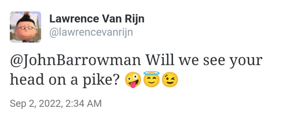 I could not resist and asked him whether we will see his head on a pike and THAT got thrown from Twitter (or taken from the throne of Twitter). Yet ANYONE who followed Game of Thrones will know that Sean Bean’s head was placed on a pike at the end of season 1, as such I thought it was funny and when you think if it, it is. But that got me banned. So was this John Barrowman who felt threatened? I doubt that, but I cannot tell because the reason of why this tweet caused the block is currently unknown. If it is machine learning and deeper learning we see its failure. Putting ones head on a pike could be threatening behaviour, but it came from a previous tweet and the investigator didn’t get it, the system didn’t get it or the actor didn’t do his homework. I leave it up to you to figure it out. Optionally my sense of humour sucks, that to is an option. But if you see the emoji’s after the text you could figure it out.