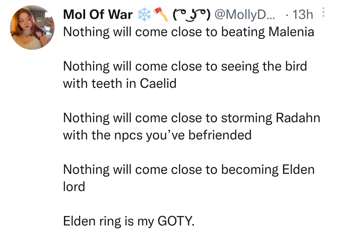 A tweet brought Me back to my senses. This lady is totally nuts about Elden Ring. I get that drive, that devotion, optionally that obsession. I do not agree with her, but that I her right. I did not play Elden ring. I could never finish BloodBorne. I still have it as it is one of the most beautiful games I have, next to Dark Souls 3, a game I equally never finished. Both utterly sublime, but in my lifetime I doubt I will ever finish that. Yet it was about her feeling. I thought I had the same with Horizons: Forbidden West. But then God of War: Ragnarok came. I am taking me time as every corner, every sight is a feast for the eyes. I lost a few lives, but that is OK. The game delivers again and again and the story is magnificent, as is the music. I do not believe that Guerrilla software has anything to fear. There is space to love control of both Kratos and Aloy. Two amazing pieces of faming IP, this was a good gaming year and I am not forgetting Gotham Knights. Three Amazing journeys. Yet at present I am knee deep in Asgardian folklore and epic myths and Santa Monica Studios deliver in ways you cannot believe (unless you are playing the game) it is good that in the twilight of my life I can still be amazed by games. I started gaming in 1984 and I never stopped. I might not have the drive I once had (like playing 167 levels of Loderunner on the CBM64 in one sitting). I did take a sickie for that event. It was a time when you could pause a game, but you could not save a game. Still, 38 years later and that gam is still part of me. Games evolved from CBM64 we got the CBM Amiga, then PC, then the PlayStation range one through five and gaming never disappointed. I might not like everything, but that is not required. There is space for the yearners of Elden Ring, the obsession with Quake, Halo and Bethesda games. It is an inclusive group, the more the merrier.