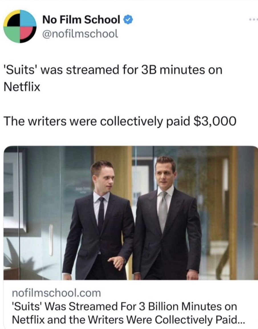 So a series that streamed over 3,000,000,000 minutes, making it one of the most profitable and most successful series even, the writers were collectively paid $3,000. Please explain to me in what universe 3 billion streamed minutes gives us a combined pay check of $3,000? You see those three billion minutes amount to 138,121.5 years. Does it make sense now? The writers are beyond underpaid. They are the legal slaves of America and they deserve their right coin. But American history is seeded with injustice and exploitation and to be honest until the LA Times piece I did not see it, so who else was unaware? We are given snapshots, yet until you see the entire vertical of exploitation it makes little sense and now with that streaming vertical exposed you can see just how unfair it is and one series, the series suits, showed us just how much the writers are fed up with being ignored what should be rightfully theirs.
