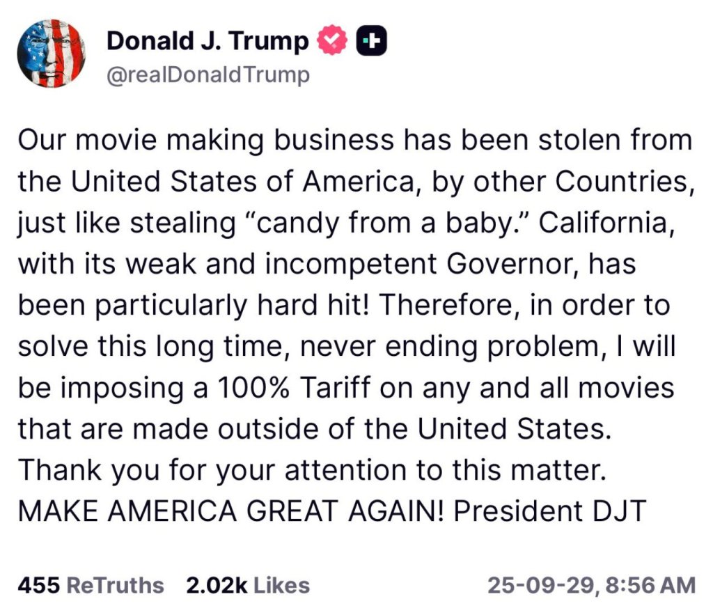 I reckon this might be the sillies move the American administration has brought to its own shores. Hollywood was already fighting an uphill battle, but this might be the traffic threshold set just before the top of the hill that will stop whatever they had going for them.